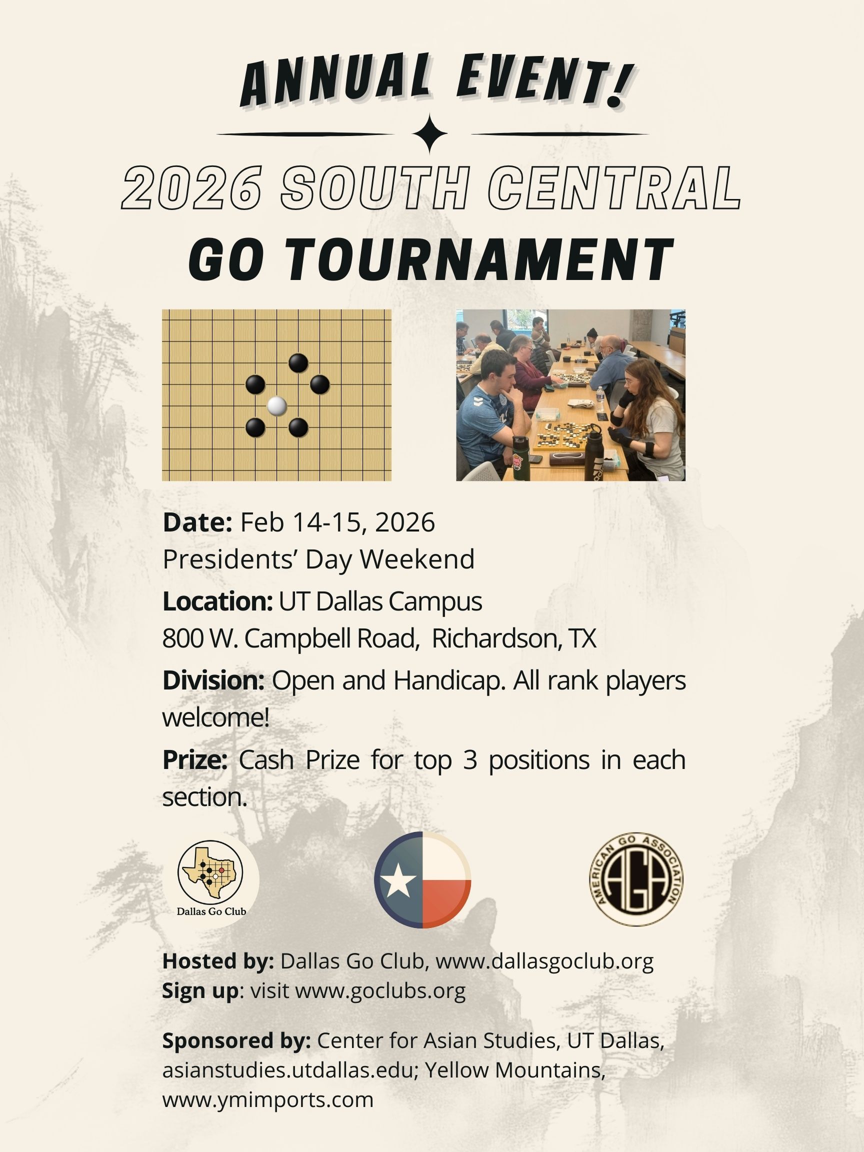 Dallas Go Club is proudly hosting the 12th South Central Go Tournament on the Presidents' Day weekend (Feb. 14 - 15) of 2026.